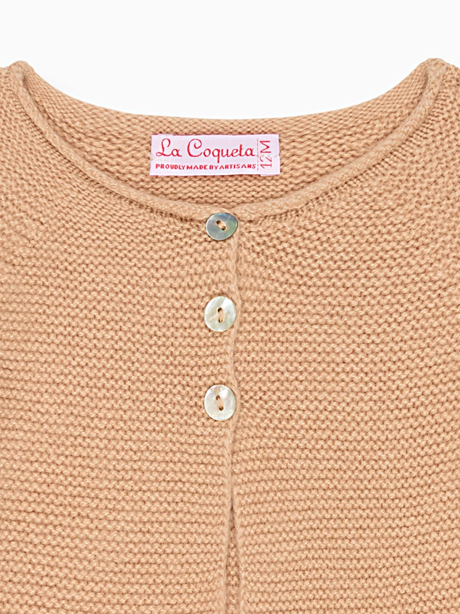 Wrap your little one in warmth and luxury with La Coqueta's range of cashmere pieces, designed with love to keep winter chills at bay. The Leandra Cashmere Baby Cardigan is crafted from supersoft 100% cashmere, gently protecting delicate skin and making those early moments with your baby even more special. Rendered in a classic shade of camel, it is perfect for both baby girls and boys. With long sleeves and a relaxed silhouette, it offers all-day comfort, featuring a mother of pearl button placket and dropped shoulders to ensure your little one stays cosy and stylish throughout the season. A timeless cashmere cardigan is the perfect gift for new arrivals, adding a touch of elegance to their first months.