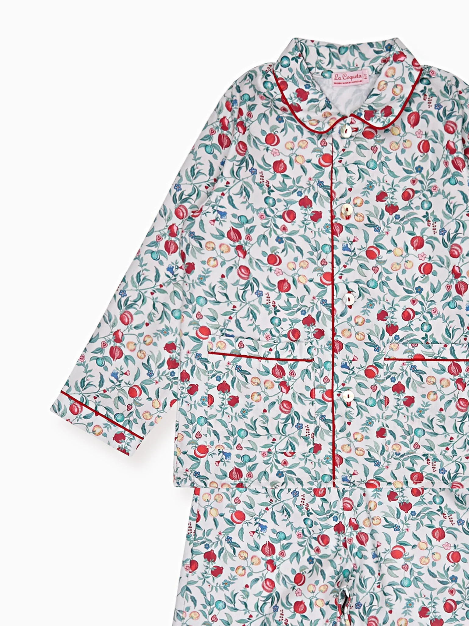 Let your little one dream their wildest dreams this season with La Coqueta's Romera Kids Pyjamas. Perfect for curling up at home after a busy day, they are crafted from pure cotton that is breathable and kind to even the most delicate skin. Rendered in our dreamy pomegranate print, the top has a button-up front for a traditional feel, with long sleeves, patch pockets, and a charming Peter Pan collar traced with red piping, while the trousers feature a comfortable stretchy waistband with a drawstring tie and long legs to keep your little one extra cosy. Loved by girls and boys alike, they'll ensure your little one can focus on their beauty sleep in true La Coqueta style.