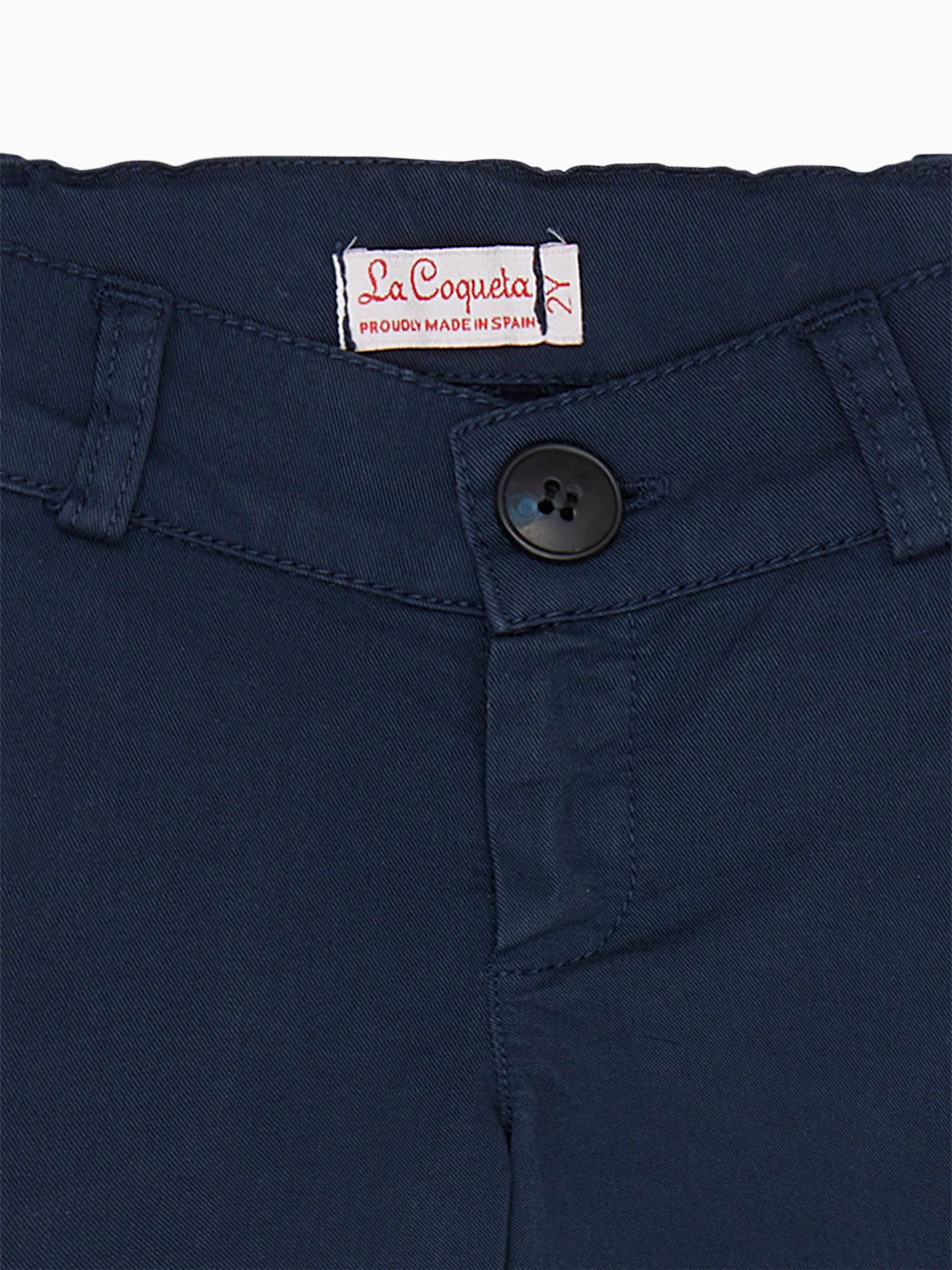 The Elio Boy Chinos are a quintessential La Coqueta favourite, designed to offer timeless style, comfort and versatility for every young gentleman. Created to be worn year-round, they are one of those dependable wardrobe staples that guarantee plenty of wear, whatever the occasion or season. Rendered in a versatile navy hue, these chinos are effortlessly adaptable and can be dressed up or down with ease. Crafted from high-quality cotton with a touch of elastane, they provide just the right amount of stretch for comfort and ease of movement, making them ideal for busy days on the go as well as smarter occasions. The tailored slim-fit silhouette strikes the perfect balance between polished and practical, ensuring a neat look without compromising on comfort. Thoughtful sartorial details define the Elio Chinos, including a handcrafted button placket with zip fastening, belt loops, slanted front pockets and discreet back pockets for a refined finish. Designed with growing children in mind, they also feature an internal waist adjuster with elastic and hidden buttons, allowing the waistline to be adjusted for the perfect fit and ensuring longevity as your little one grows. Equally suited to school days, family gatherings or special occasions, these chinos pair effortlessly with crisp cotton shirts, soft knitwear or casual polos.