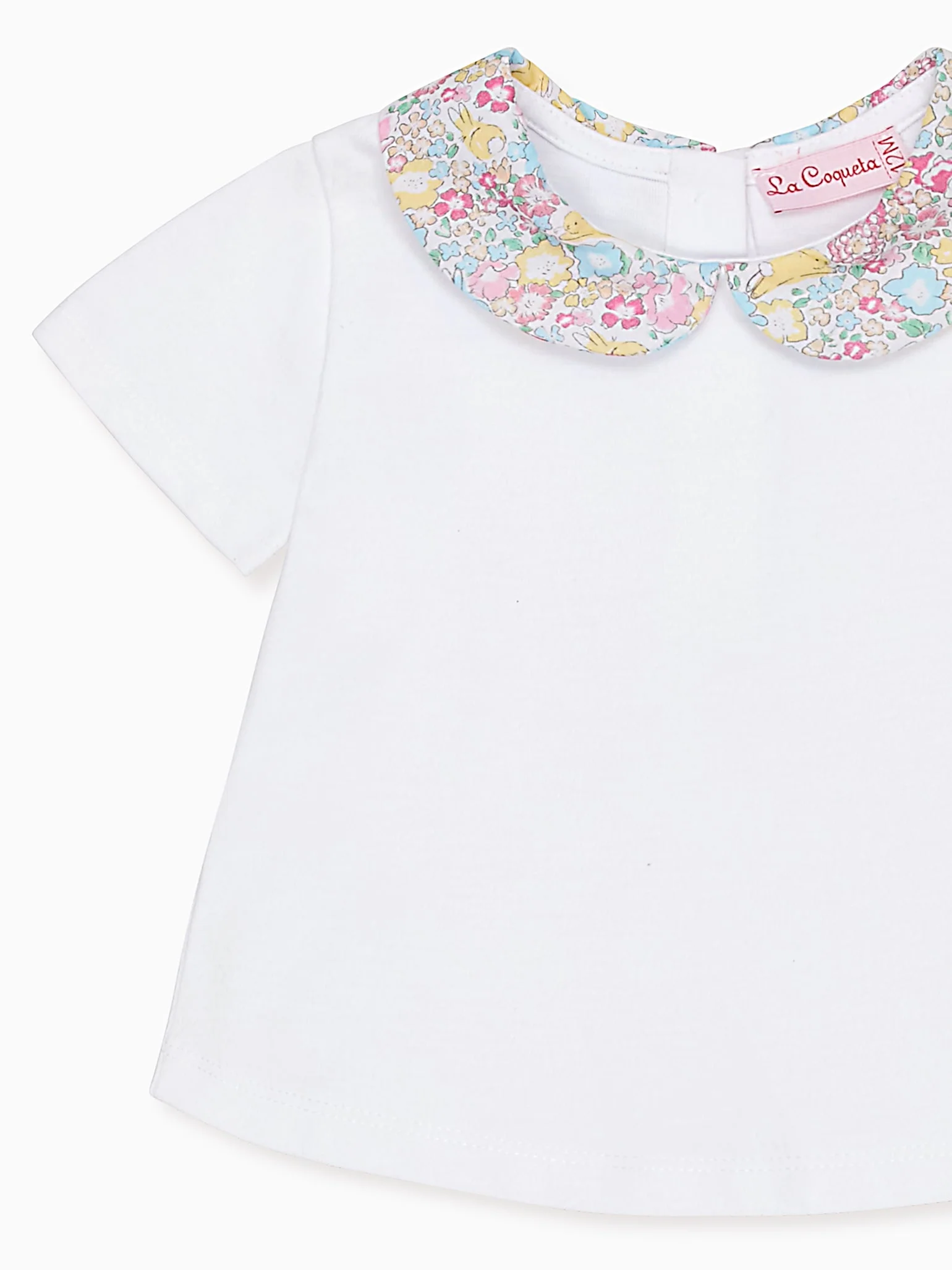 Elevate your baby’s nursery wardrobe with La Coqueta’s Leo Baby Top, a timeless piece designed for style, comfort, and everyday versatility. Crafted from supersoft pure cotton in classic white jersey, it is breathable and gentle on even the most delicate skin, making it ideal for warmer months or layering year-round. Cut in a relaxed, boxy silhouette with dropped shoulders and short sleeves, it allows complete freedom of movement for crawling, stretching, and play. Thoughtful finishing touches include a charming, contrasting Peter Pan collar, quintessentially La Coqueta in style. The collar is adorned with a beautiful hand-drawn exclusive print, meticulously designed in-house at our Notting Hill studio. Inspired by vintage botanical illustrations, delicate florals and playful bunny motifs were first hand-rendered before being digitally refined and printed in Spain in small runs. The result is a soft, painterly pattern in dusty pink, blue, and yellow hues that adds a gentle pop of colour. A mother of pearl button placket at the back ensures easy dressing, while the lightweight cotton fabric keeps your little one comfortable all day long. Effortlessly versatile, the Leo Baby Top pairs perfectly with La Coqueta’s cotton dungarees, soft trousers, or shorts for everyday wear, family gatherings, or casual outings.