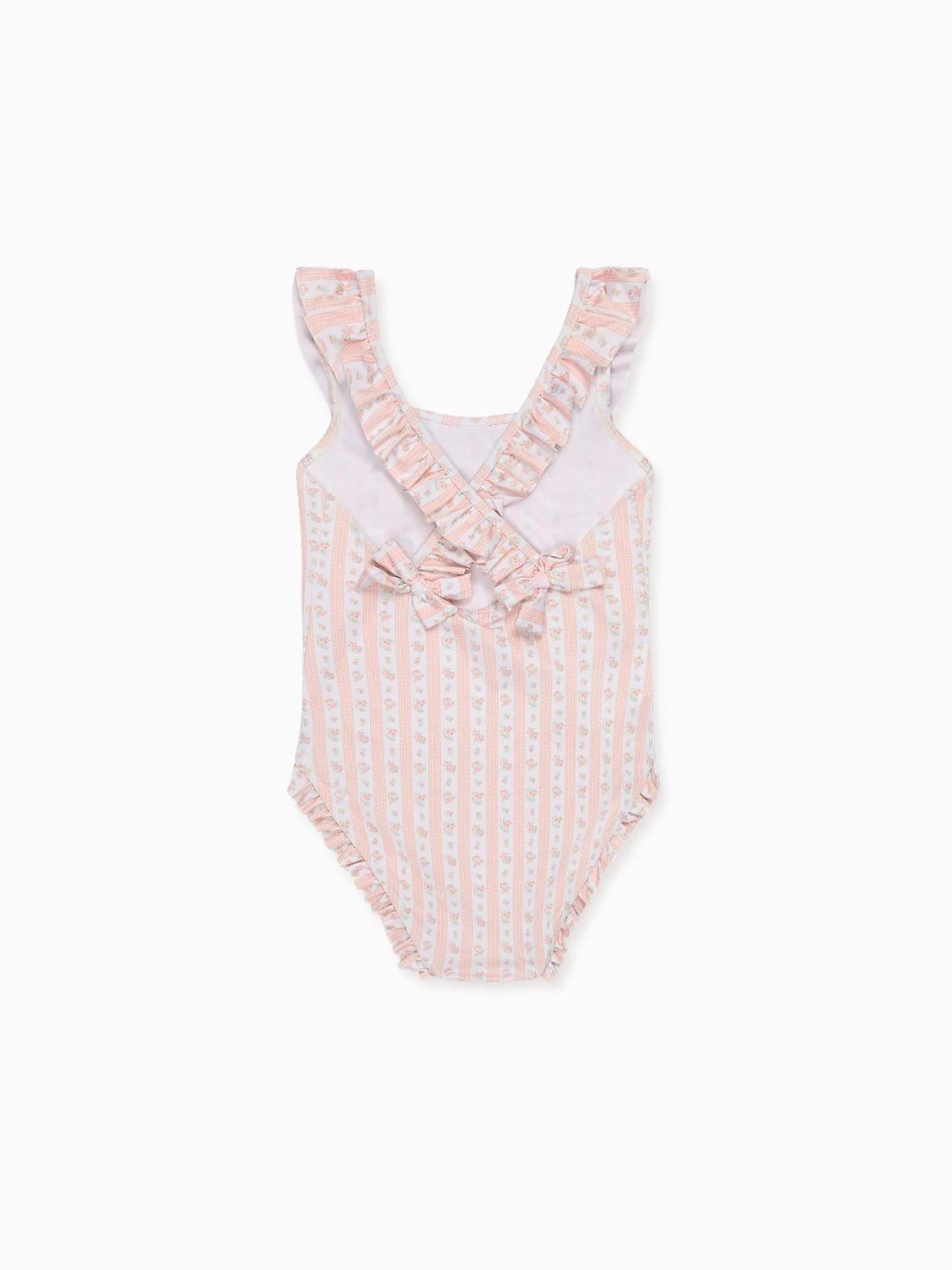 La Coqueta's Opal Girl Swimsuit combines classic swimwear silhouettes with our signature attention to charming, feminine details. Crafted from high-quality recycled polyester with excellent stretch and recovery, the fabric is soft against delicate skin while providing the durability needed for active beach days and pool adventures. Using recycled materials also helps reduce plastic waste by giving fibres a second life. The sweet pink base is decorated with a stunning hand-drawn exclusive print, meticulously designed in-house at our Notting Hill studio. Inspired by vintage botanical illustrations, delicate floral and stripe motifs were first hand-rendered before being digitally refined and printed in Spain in small runs. The result is a soft, painterly pattern in dusty pink hues, beautifully complementing the feminine details, while gathered ruffle trims frame the scoop neckline and legs for a playful, vintage-inspired finish. The crossed-back strap design ensures a secure and comfortable fit, allowing complete freedom of movement for swimming, playing, and easy changing on the beach or at the pool. Proudly made in La Coqueta's family-owned ateliers, the Opal Girl Swimsuit blends heirloom-quality craftsmanship with practical construction parents can trust. Perfect for summer holidays, swimming lessons, or poolside fun, it’s a stylish and thoughtful addition to any little girl’s warm-weather wardrobe.