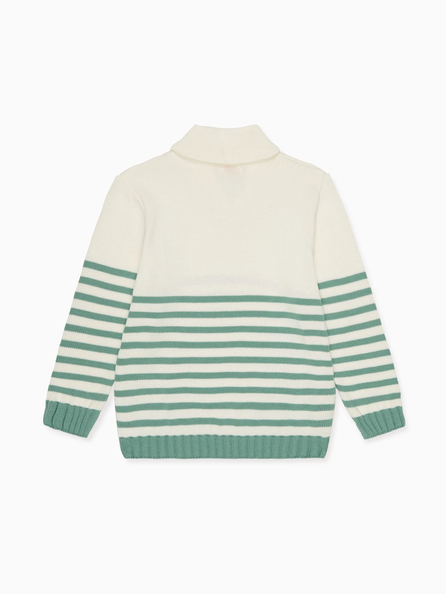 The Goyo Boy Cotton Jumper is a perennial favourite, designed for year-round wear and elevated with La Coqueta’s signature attention to detail. Expertly knitted in Spain from pure cotton, this effortless everyday layer has a soft, cosy handle with natural stretch, ensuring comfort without compromising on style. The classic shawl collar is complemented by a handcrafted wooden button at the neckline, lending a charming, artisanal finish that feels both timeless and distinctive. Thoughtfully designed with dropped shoulders and long sleeves, the silhouette is relaxed yet polished, while chunky ribbed trims at the hem and cuffs add structure and durability. Rendered in a sophisticated sage green and ivory stripe, this versatile jumper brings a fresh yet classic feel to weekend dressing and everyday adventures alike. Perfect for layering, it pairs beautifully over a crisp La Coqueta cotton shirt for added warmth, or can be styled with tailored shorts or cotton-rich chinos for an effortlessly refined look. A dependable wardrobe staple, the Goyo Jumper offers comfort, craftsmanship, and understated elegance in equal measure.