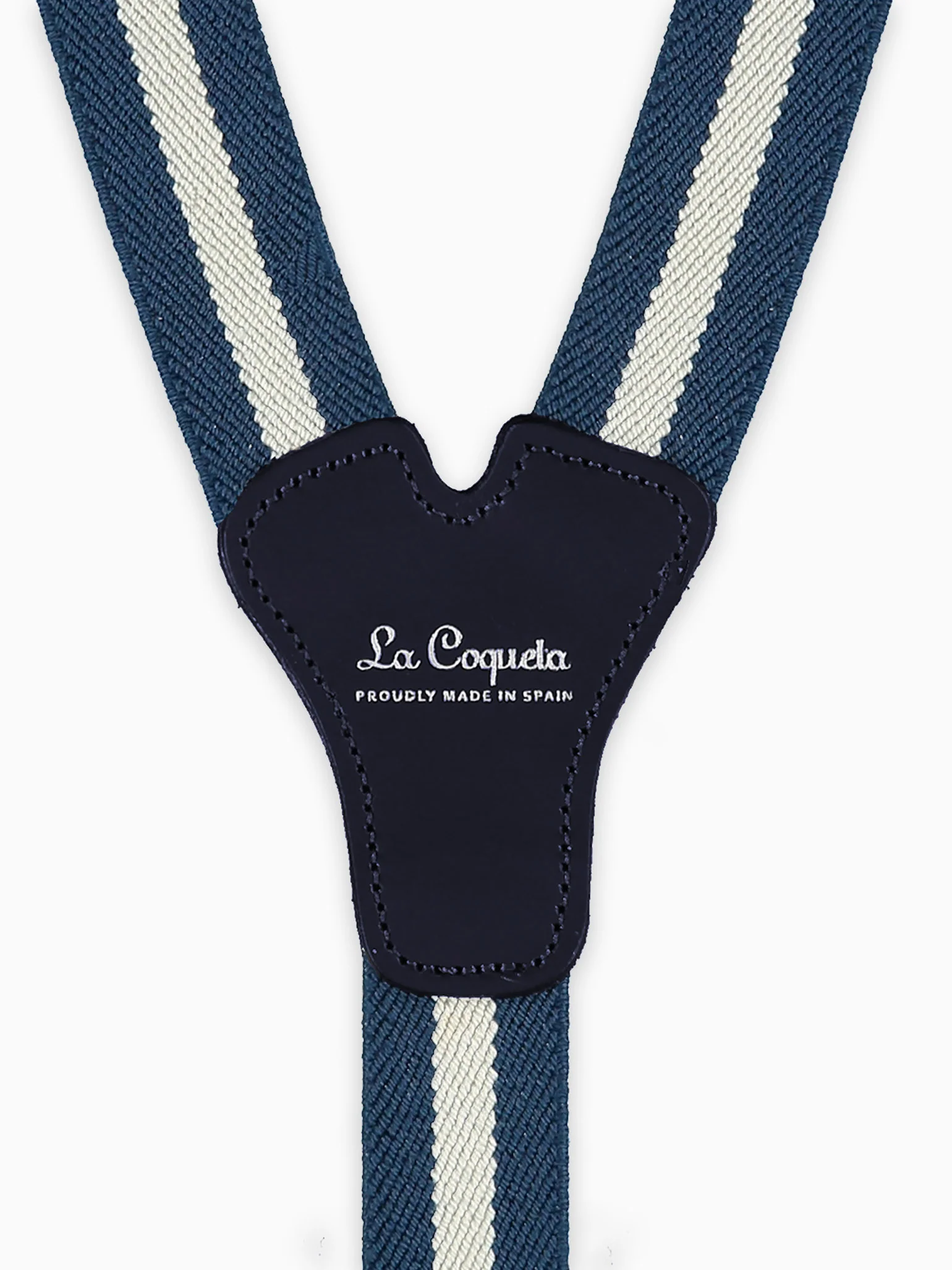 Create a sleek and sophisticated finish to your little one's outfit with these stylish Boy Braces, designed with Nappa leather details and woven stretch fabric. Handmade in Spain, they're the ideal choice for both formal and casual looks, finished with a handy clip closure. They are available in a range of versatile colours that perfectly complement any outfit and are school-friendly. This version comes in a charming white and navy blue stripe.