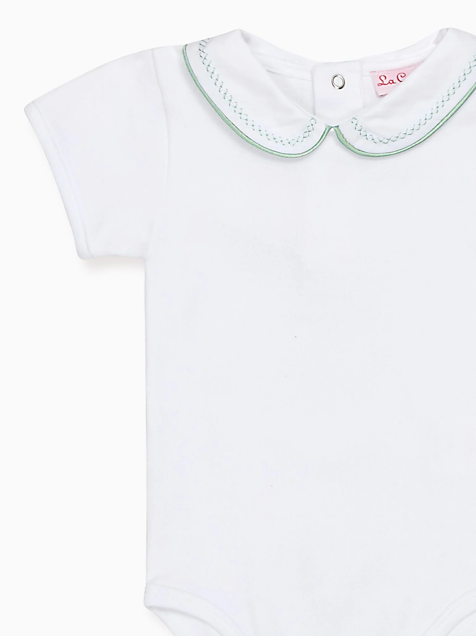 La Coqueta’s Patricio Baby Body Vest is a timeless nursery essential, designed as the perfect foundation for your baby’s growing wardrobe and offering endless styling possibilities for any occasion. Crafted from premium cotton jersey in a classic shade of white, it has an exceptionally soft, breathable handle that is gentle on even the most delicate skin, ensuring all-day comfort from first wear onwards. Thoughtfully designed for practicality, this unisex body vest features dropped shoulders and short sleeves for ease of movement, alongside nickel-free poppers at the back and crotch for fuss-free dressing and quick changes throughout the day. In true La Coqueta style, it is finished with a charming flat Peter Pan collar, delicately decorated with sage green embroidered trims that add a subtle touch of elegance and traditional craftsmanship. Ideal for layering during the colder months or wearing on its own in warmer weather, the Patricio Baby Body Vest pairs beautifully under La Coqueta’s classic dungarees, knitted sets, or tucked into soft trousers for an effortlessly refined look. Designed with longevity in mind, it is a versatile piece that can be passed down to younger siblings for years to come, making it a practical yet beautifully considered addition to any nursery wardrobe.